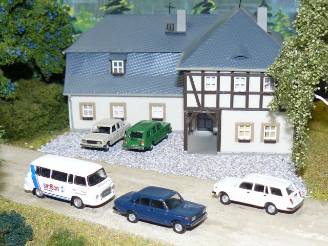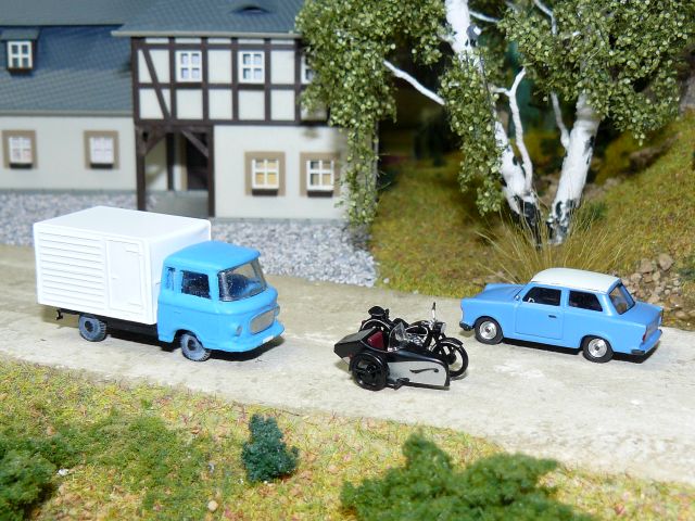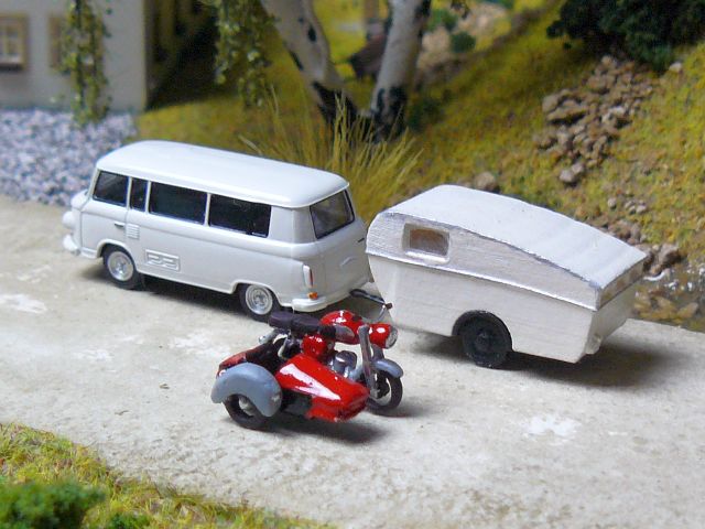 ![]() B1000 Kleinbus mit Herpa Dethleffs Tourist Wohnwagen Modellbau Höhlein und MZ TS 250 mit Superelastik-Seitenwagen Permo |