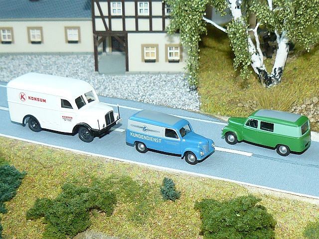 ![]() IFA H3A Kastenwagen mit Kühlkoffer "Konsum" Studio ALi und Framo V901 Kastenwagen "Kundendienst BARKAS-Werke" sowie Framo V901 Halbbus Busch |