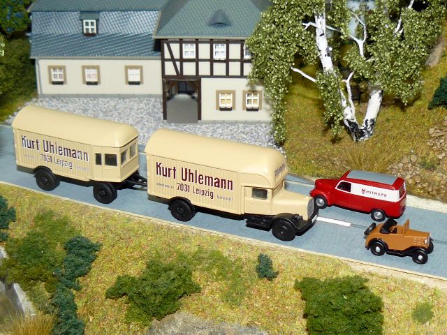 ![]() MB L2500 Möbelkoffer mit Möbelanhänger "Kurt Uhlemann Leipzig" und Jano Modellbau für Tillig Framo V901/1 Kastenwagen "Mitropa" Busch sowie Dixi 3/15 DA Cabrio P.L. Modell |