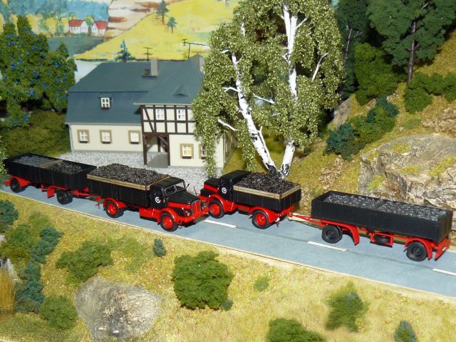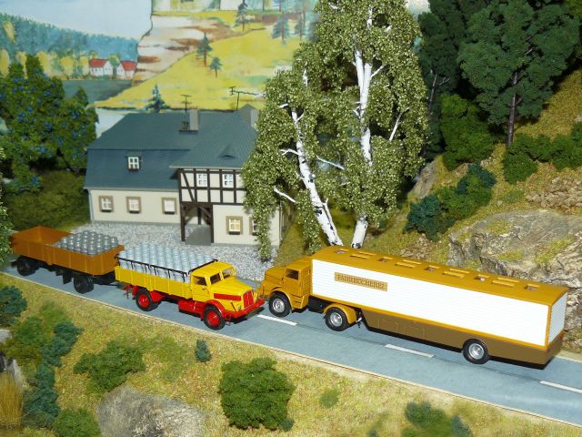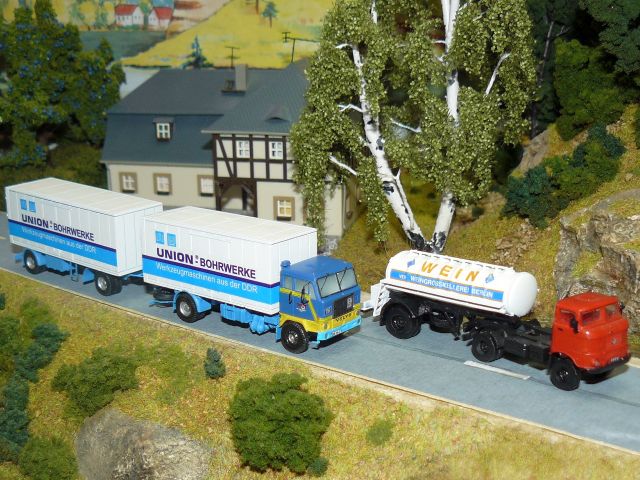 ![]() Volvo F88 Koffer-Lastzug "UNION-BOHRWERKE" und Bausatz von Stepnicka IFA W50 L/S mit HLS 90.45/5 für Flüssigkeiten "Weingroßkellerei Berlin" Bausatz von panzershop.nl, beide gebaut von Ralph Lusansky |