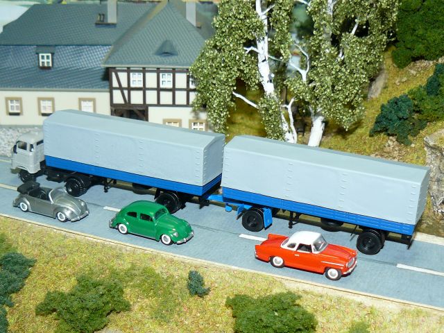 ![]() IFA W50 mit 2 Aufliegern HL 100.02 Pr./ Pl. und Dolly-Achse (DDR-Gigaliner), TT-Koch VW-Käfer Cabrio und VW Käfer Limousine mit Weißwandreifen Dr. J. Kunze Modellbau und Skoda Felicia Super (Typ 996) Cabrio Hardtop mit Weißwandreifen V&V model |