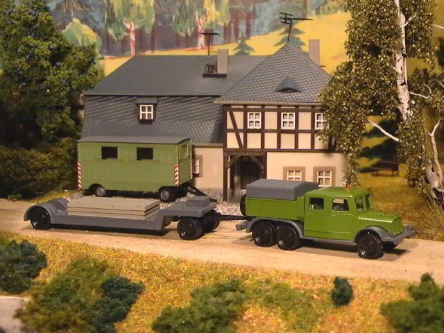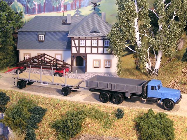 ![]() KrAZ 214 Pritsche (lang) RK-Modelle mit 8m-Rungenwagen Uli's Messing-Manufaktur Transportanhänger mit Dachbinder Busch |