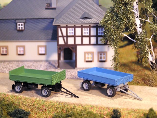 ![]() Anhänger HW 60 mit erhöhter Front- und Heckwand, Ballonreifen (grün) und mit niedrigen Bordwänden sowie Straßenbereifung (blau) MODELLTEC GmbH |
