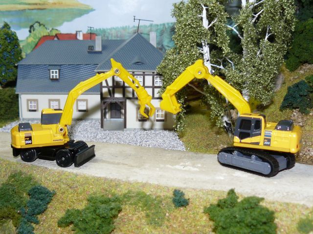 ![]() Komatsu PW200 Mobilbagger mit Rohrgreifer und Komatsu PC200 Hydraulikbagger mit Tieflöffel (Trasse) Takara Tomy |