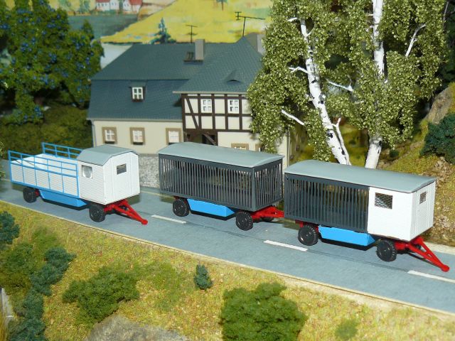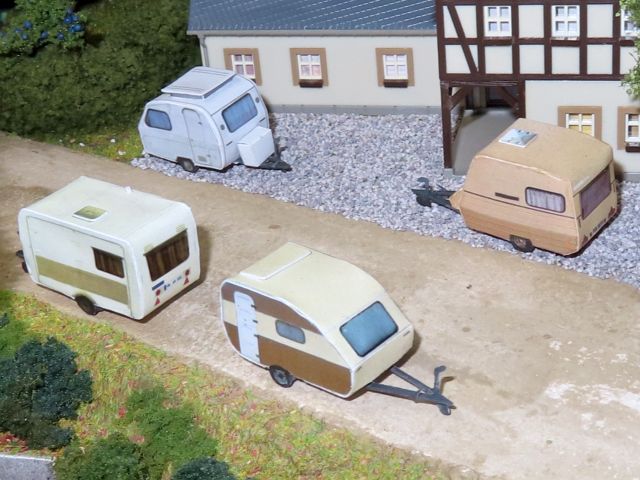 ![]() QEK Aero, Bj. 1987, Intercamp 355L (Berger Oase), Bj. 1984, Lausitz 310k, Bj. 1986 und Niewiadow 126E (PREDOM, Purscherl), Bj. 1984 als Artistenwohnwagen Phils Miniaturwelt |