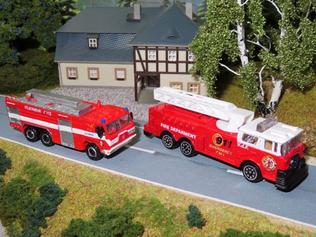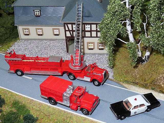 ![]() 1953 MACK B-series Schleppleiter, 1966 MACK R-series Pumper und 1966 Ford Galaxy 500 "Police" RailTT |