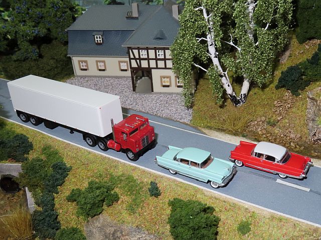 ![]() 1950 Kenworth COE "Bullnose" (dreiachsig) mit Zweiachsauflieger und 1956 Lincoln Capri mit Weißwandreifen RailTT |