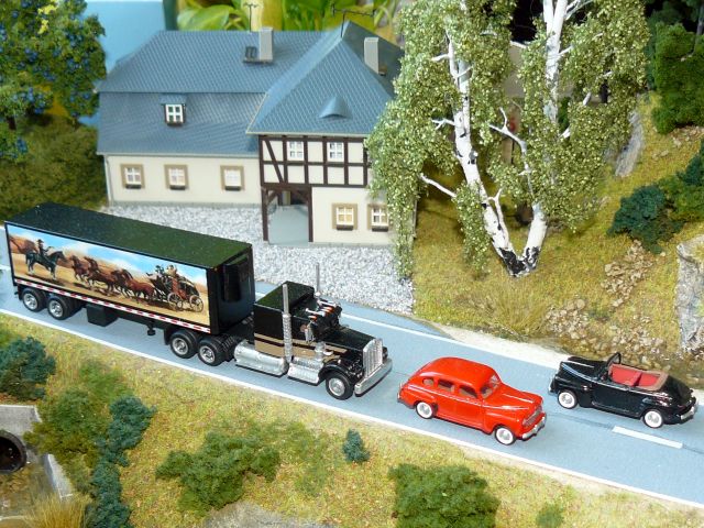 ![]() 1976 Kenworth W-900 mit Schlafkabine und Kofferauflieger aus dem Film "Ein ausgekochtes Schlitzohr", 1946 Ford De Luxe Limousine und 1946 Ford De Luxe Cabrio RailTT |