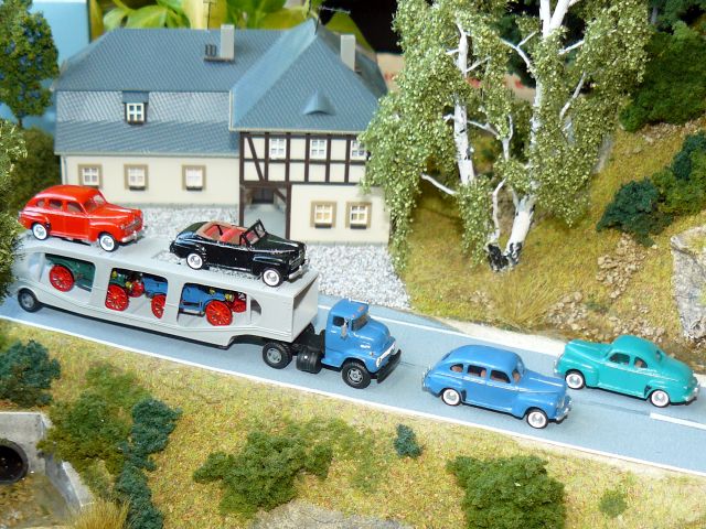 ![]() 1956 Ford COE Autotransporter (Ladung siehe voriges Bild [oben] bzw. nächstes Bild [unten]), 1942 Ford De Luxe Limousine und 1946 Ford De Luxe Businesscoupé RailTT |