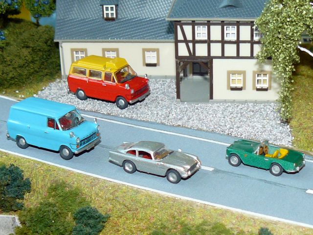 ![]() Ford Transit MK1 Camping-Bus mit Hubdach und Dachkoffer, Ford Transik MK1 Lieferwagen, Aston Martin DB5 und Triumph TR-4 Roadster etchIT |