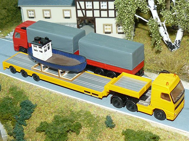 ![]() Volvo FH16 Tandemzug Pr./ Pl. und Volvo FH16 mit Tieflader 3-achsig (12 Räder) mit Fischkutter auf Transportgestell TAM |
