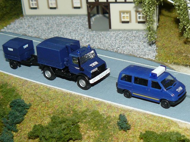 ![]() Unimog Pr./ Pl. mit Ladekran und Einachsanhänger Pr./ Pl. des THW sowie TAM VW T4 Mannschaftstransportwagen des THW (Blaulichtbalken durch mich verändert) Roco |
