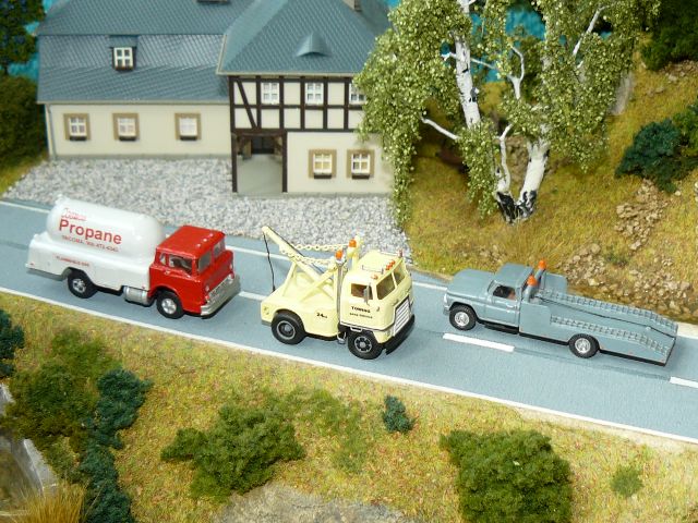 ![]() Ford C-800 Flüssiggas-Tankwagen "Cosmos", aus Bausatz von EA Electronics 1965 International Transtar Abschleppwagen und 1966 Chevrolet C-30 Abschleppwagen RailTT |