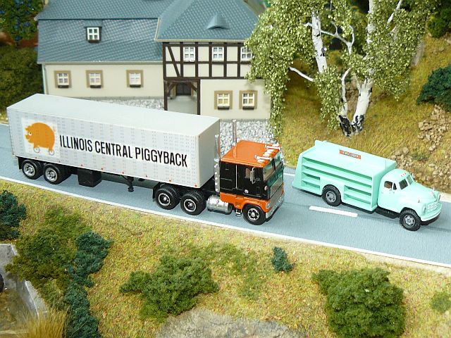 ![]() Ford CL-9000 mit Schlafkabine und Kofferauflieger "Illinois Central Piggyback" und 1949 Studebaker 2R17 Getränke-LKW "Dr. Pepper" RailTT |