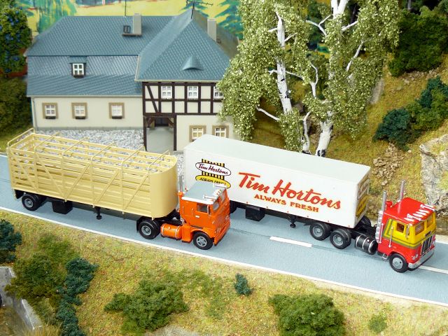 ![]() 1959 GMC F/D "Crackerbox" Viehtransporter sowie Freightliner FLB mit Schlafkabine und Kofferauflieger "Tim Hortons" RailTT |