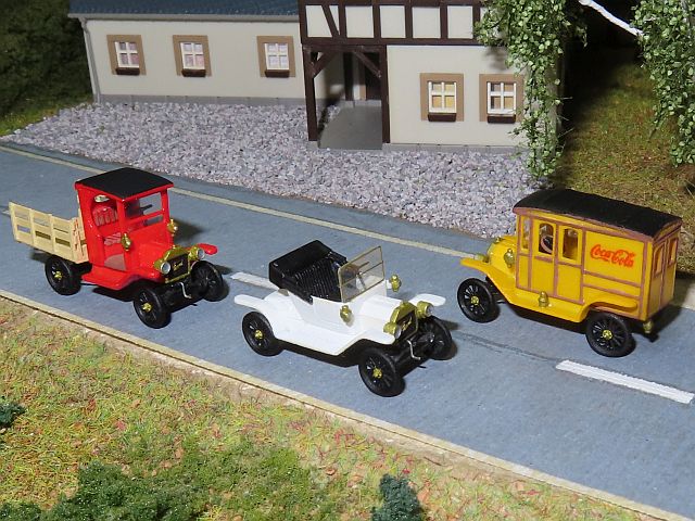 ![]() 1911 Ford T Pritschen-LKW, 1911 Ford T Roadster (offen) und 1911 Ford T Kastenwagen "Coca Cola" RailTT |