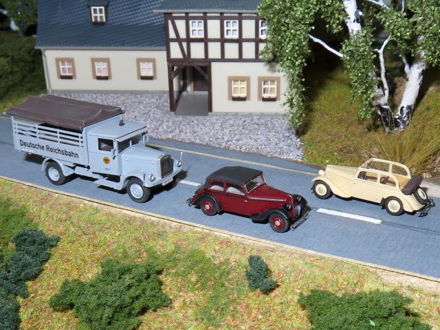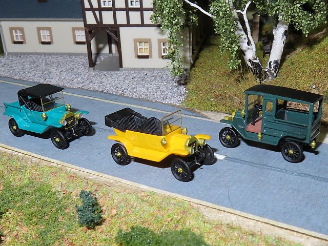 ![]() 1911 Ford T PickUp (Verdeck geschlossen), 1908 Ford T Limousine (offen) und 1911 Ford T Depot Hack RailTT |