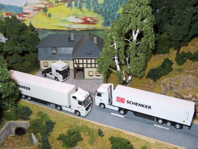 ![]() Scania R TL Sattelzugmaschine, MB Actros LH Koffer-Sattelzug und MB Actros LH Containersattelzug "DB Schenker" Herpa |