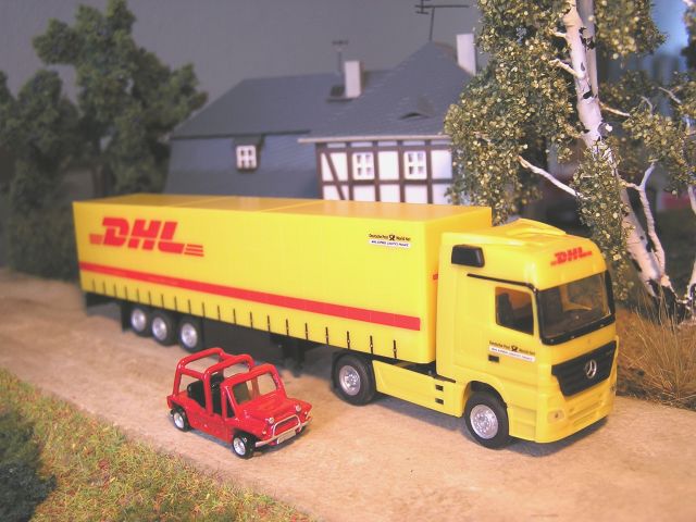![]() Mini Moke Model Planning (1:130) MB Actros LH Gardinen- planen-Sattelzug DHL Herpa |