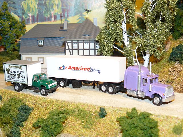 ![]() 1987 Peterbilt 379 mit Kofferauflieger "American Siding" und 1954 Ford F500 "Würzburger Beer" RailTT |