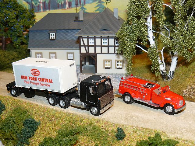 ![]() 1940 International K7 Löschfahrzeug (offen) und 1982 Mack MH Ultra-Liner mit Containerauflieger "New York Central" Rail TT |