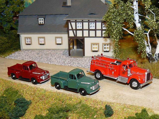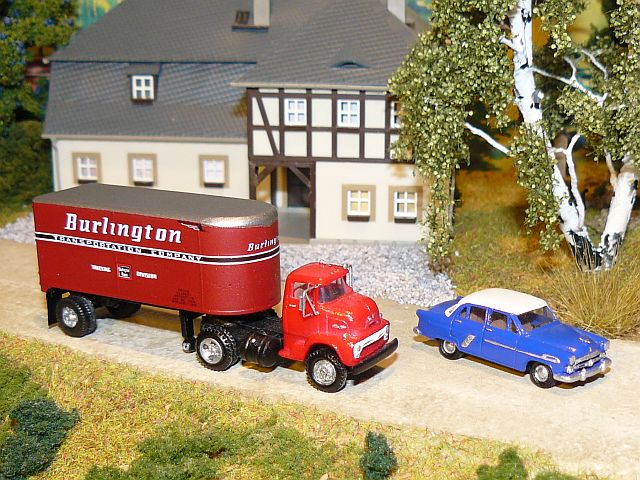 ![]() 1952 Ford Customline und 1956 Ford COE Sattelzugmaschine RailTT mit Burlington-Auflieger Lok-n-Roll |