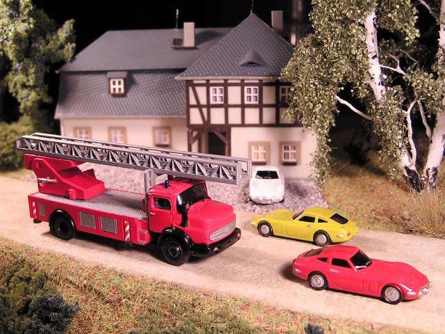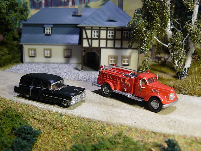 ![]() 1955 Cadillac "Bestattungsinstitut" und 1940 International K7 Löschfahrzeug (geschlossen) RailTT |