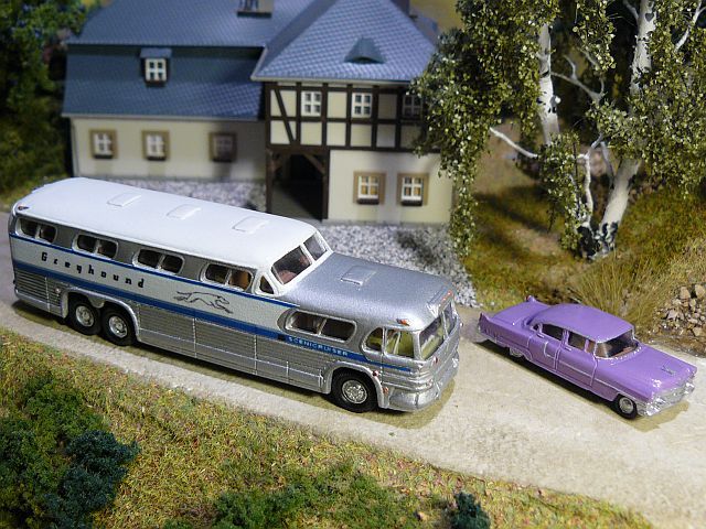 ![]() 1954 GMC PD-4501 GREYHOUND-Bus und 1955 Cadillac Fleetwood Sixty Special RailTT |