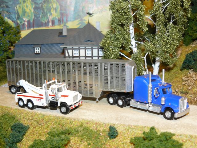 ![]() 1990 Kenworth W-900L mit Viehtransport-Auflieger und 1966 Mack R-670 Abschleppwagen RailTT |