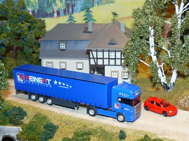 ![]() Scania R TL Gardinenplanen-Sattelzug "REINERT Logistics" Herpa VW Golf V a.d.p. |