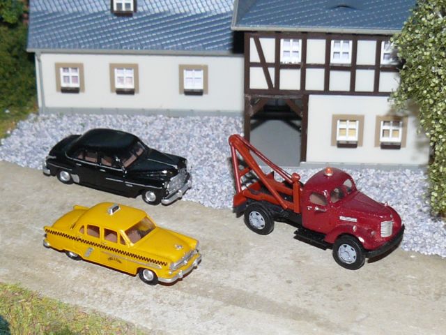 ![]() 1949 Dodge Meadowbrook, 1940 International K7 Abschleppwagen und 1952 Ford Customline Taxi RailTT |