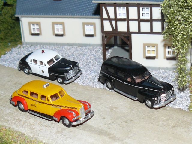 ![]() 1949 Dodge Meadowbrook Police, 1947 Cadillac 75 Leichenwagen und 1942 Packard 160 Taxi RailTT |