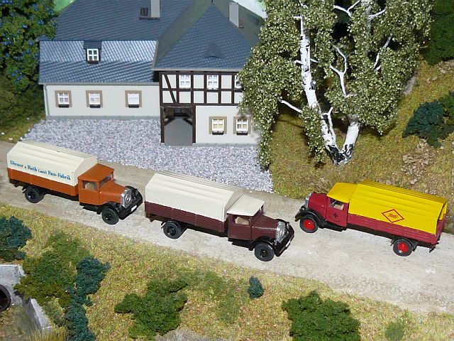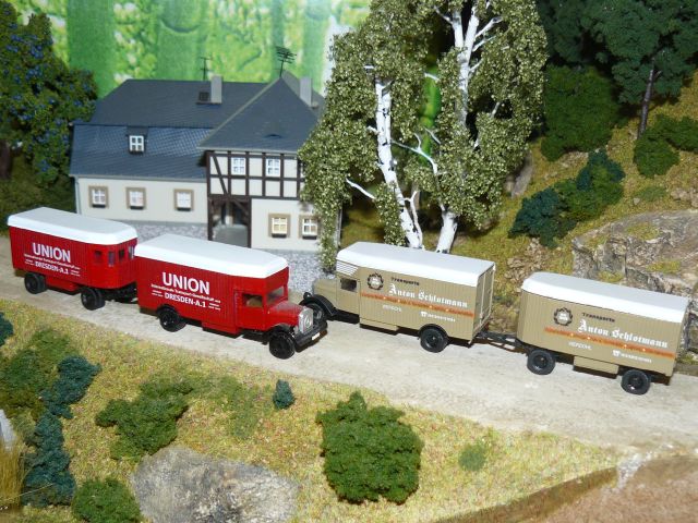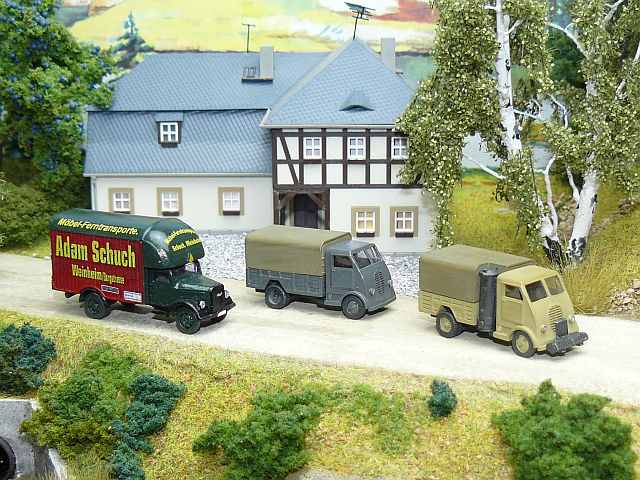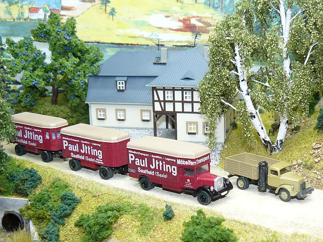 ![]() MB L2500 mit Möbelkoffer und Anhänger und Anhänger mit Kabine und Opel Blitz mit Holzgasvergaser Alexander |