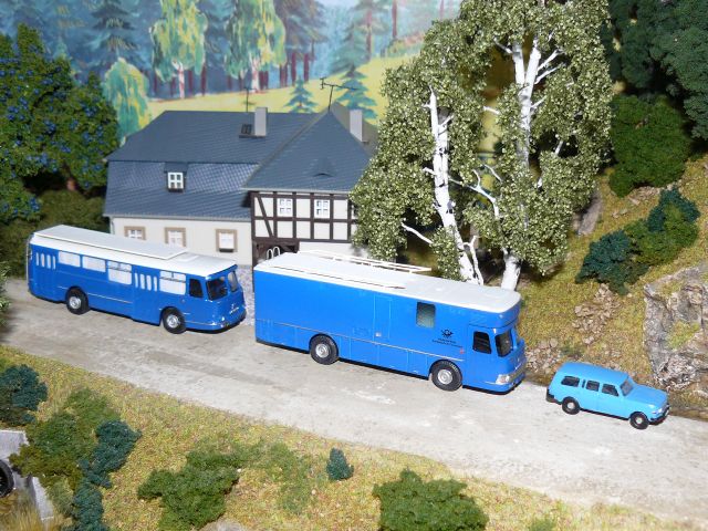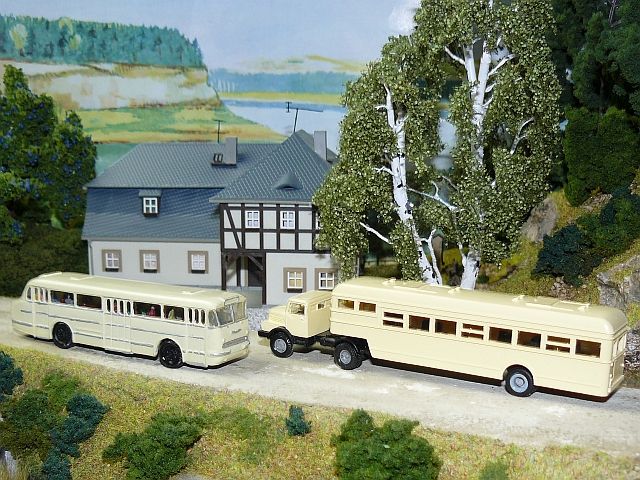 ![]() Ikarus 66 dreitürig und aus Bausatz IFA S4000 Sattelzugmaschine mit DAF-Bussattelauflieger der Wismut AG USM |