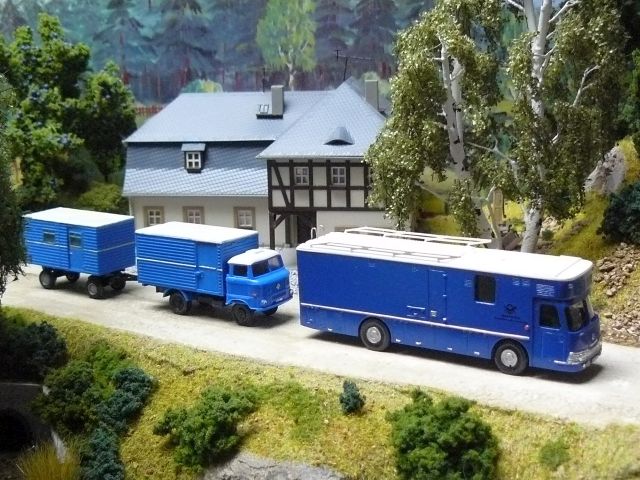 ![]() IFA W50 Kofferlastzug "Deutsche Post Fernmeldewesen" S.E.S./ Modelltec IFA H3A Pr./ Pl. "Deutsche Post" und IFA H3A Pr./ Pl. "Postzeitungsvertrieb" Tillig |