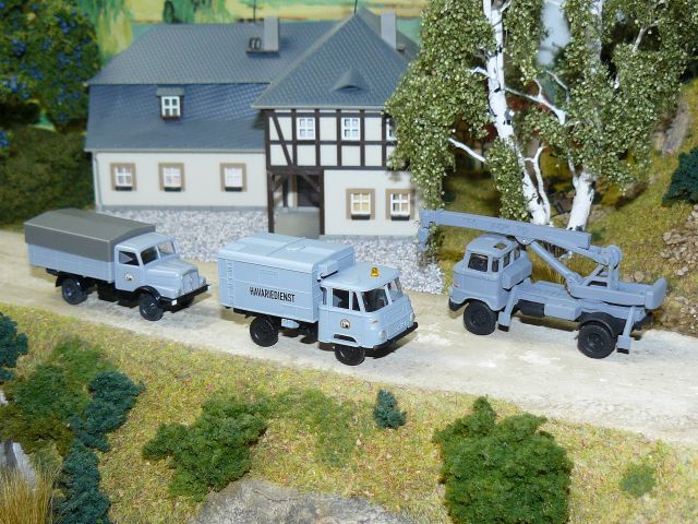 ![]() IFA H3A mit Hochbordpritsche/ Plane "Energiekombinat" und Robur LO 3000 Koffer "Havariedienst" Tillig IFA Autodrehkran ADK70 USM |