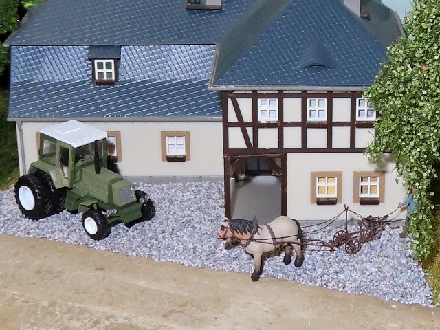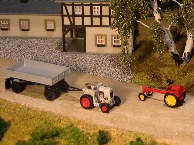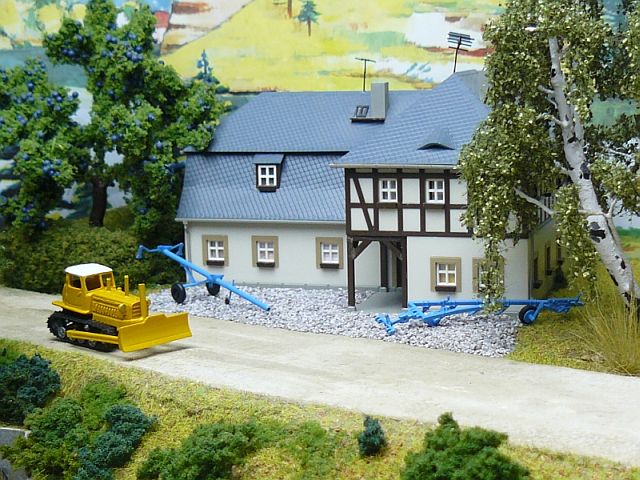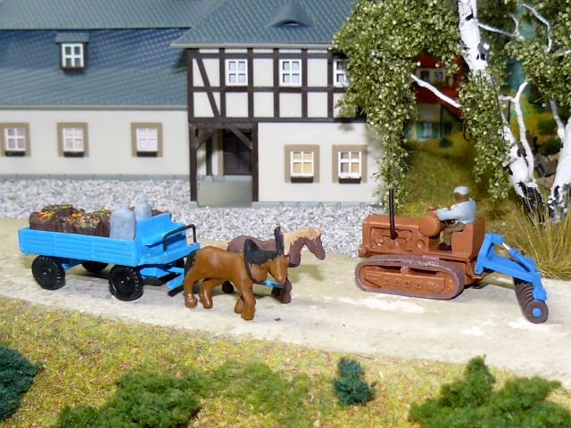 ![]() Pferdewagen mit Ladung, Famo Raupenschlepper mit Fahrerfigur Permo und Scheibenpflug Jano-Modellbau |