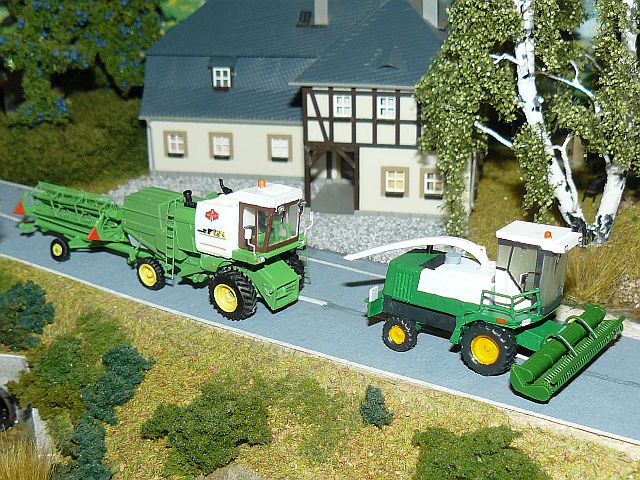 ![]() Mähdrescher Fortschritt E514 mit Schneidwerkswagen und Schneidwerk Ales Marboe und selbstfahrender Feldhäcksler E-282 mit breiter Schwadaufnahme MK (Vertrieb über auTTos.de) |