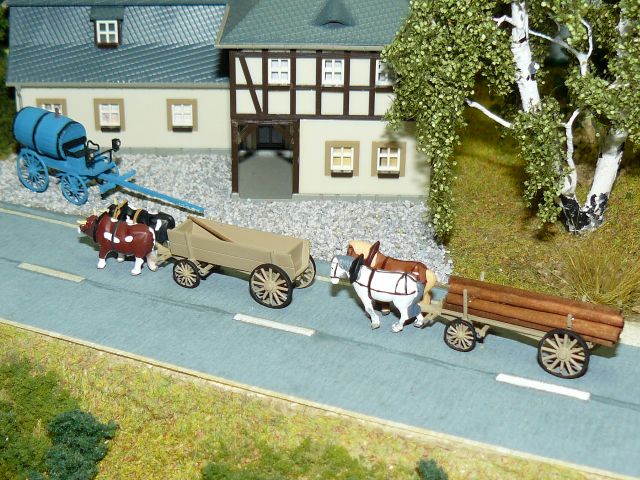 ![]() alter Fasswagen Permo Ochsengespann mit Kastenwagen und Pferdegespann mit Langholzwagen P.L. Modell |
