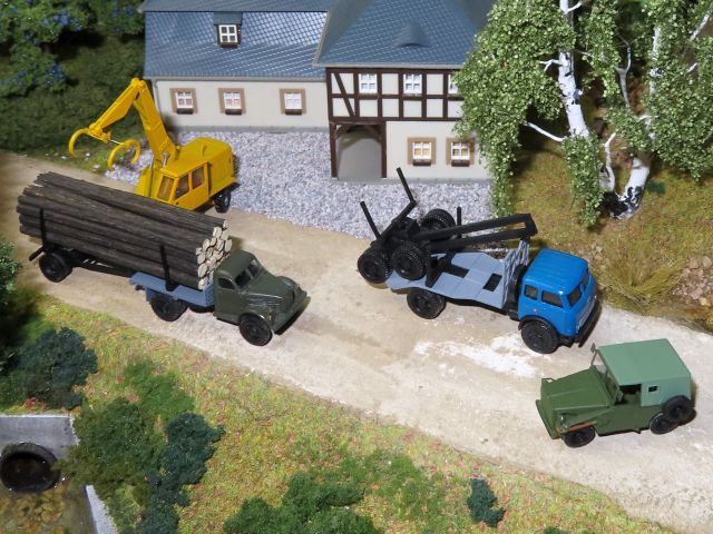 ![]() Bagger T174-2 mit Greifer für Baumstämme, GAZ 51 Langholztransporter (kurz) mit Holz und MAZ 504 Langholztransporter R. Kaczynski sowie IFA P3 Forstwirtschaft NPE Modellbau |