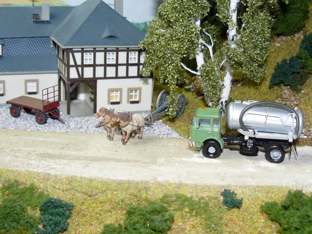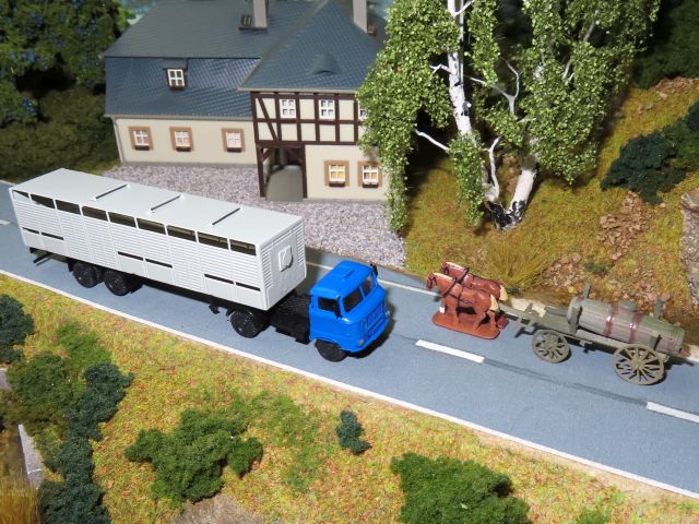 ![]() IFA W50 Sattelzugmaschine mit Viehtransportauflieger HLS 120.88 TT-Koch und Jauchewagen Permo mit zwei gehenden Pferden Hauser-Figuren |