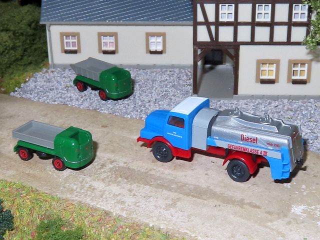 ![]() Multicar M21 Pritsche, Multicar M21 Kipper und Mehlhose/ Busch IFA H3A Dieseltankwagen "LPG Roter Oktober" Tillig |