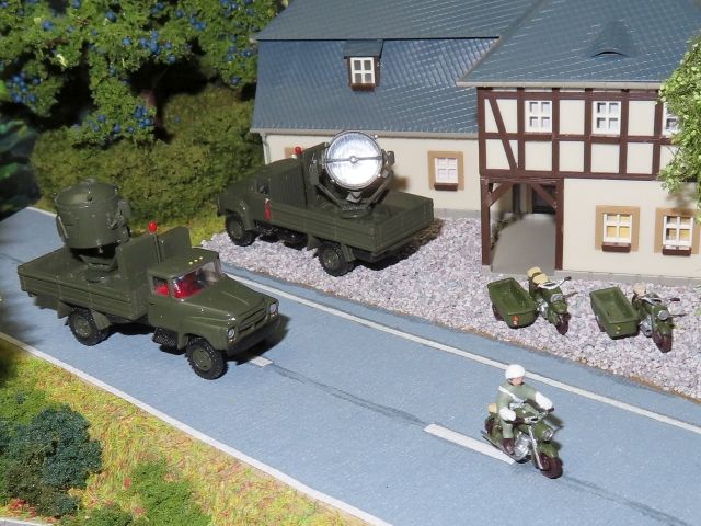 ![]() MZ TS-250 mit Kradmelder der NVA, MZ TS-250 mit Lastenseitenwagen und MZ ES-250 mit Lastenseitenwagen Permo sowie Boden-Landescheinwerfer APM-90 auf Zil 130 Pritsche R. Kaczynski |