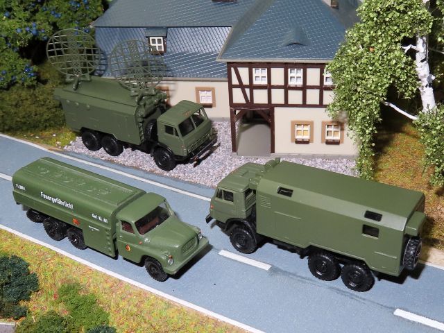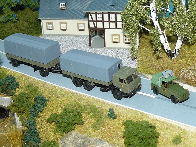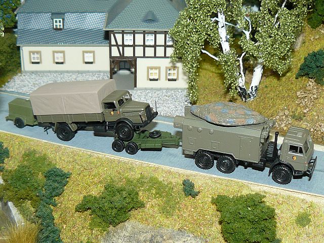 ![]() Sende- und Empfangsfahrzeug R-417 auf Basisfahrzeug KAMAZ 43101 der mobilen Troposphärenfunkstation "Baget" in Transportstellung und IFA H6 Pritschenlaster mit Plane NVA, Studio ALi Bergeachse und TAM Elektroaggregat DiDF-30/4 (GAD-30) NVA SixTTies |