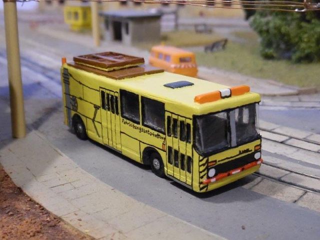 ![]() Oberleitungswagen auf Ikarus 280 Vorderwagen Eigenbau aus Holz Ulrich Kleinrensing Foto: U. Kleinrensing |